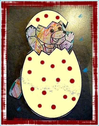 J'ai colorié par ordinateur un oeuf, et on a inséré dedans un dessin de petit ours brun colorié par Lou....