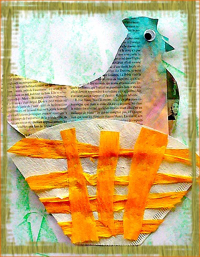 Un filtre à café décoré en panier et une poule en papier journal, attention Charlie, je crois qu'elle te surveille !